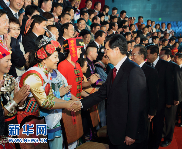 國家體育館燈火輝煌,洋溢著熱烈喜慶的氣氛。演出開始前,胡錦濤等黨和國家領導人親切會見了演職人員代表。這些代表中,有深受群眾喜愛的著名少數(shù)民族藝術家,有來自少數(shù)民族地區(qū)的民間歌舞藝術家,還有來自香港、澳門和臺灣地區(qū)的少數(shù)民族文藝界人士。胡錦濤等來到身著鮮艷民族服裝的演職人員代表中間,同他們親切握手、熱情交談。胡錦濤勉勵大家堅持唱響民族團結進步的主旋律,為繁榮發(fā)展少數(shù)民族文藝事業(yè)作出新的更大貢獻。
