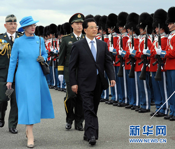 6月14日,中國國家主席胡錦濤抵達丹麥首都哥本哈根,開始對丹麥進行國事訪問。這是胡錦濤主席出席丹麥女王瑪格麗特二世在機場舉行的歡迎儀式。新華社記者 李濤 攝