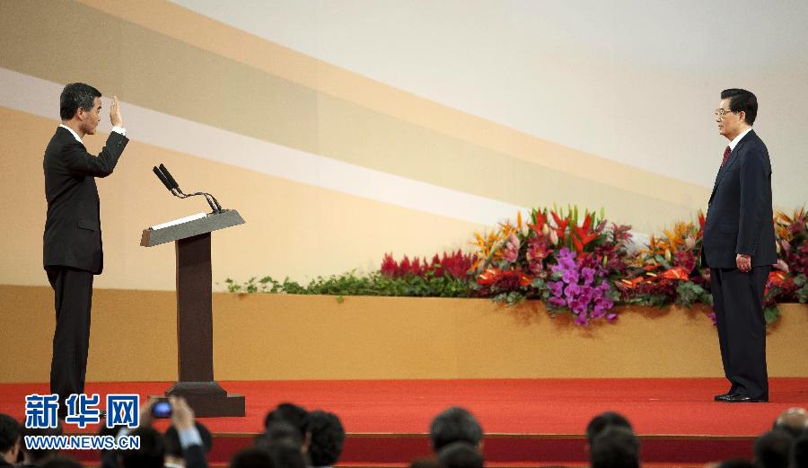 香港特別行政區(qū)第四任行政長(zhǎng)官梁振英首先上臺(tái)宣誓。他面對(duì)胡錦濤主席,舉起右手莊嚴(yán)宣誓。