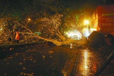8月8日晚,園林工人在處置被刮倒的行道樹 吳明亮 攝