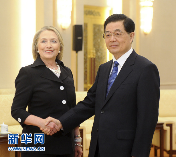 新華社快訊:國(guó)家主席胡錦濤5日上午在人民大會(huì)堂會(huì)見美國(guó)國(guó)務(wù)卿希拉里·克林頓。