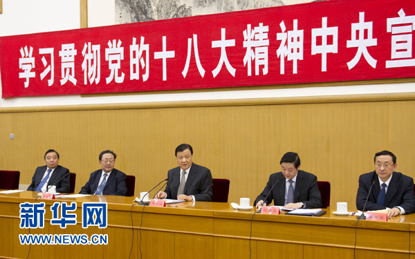 中共中央政治局常委、中央書(shū)記處書(shū)記劉云山出席會(huì)議并講話。他強(qiáng)調(diào),深入學(xué)習(xí)宣傳貫徹黨的十八大精神是當(dāng)前和今后一個(gè)時(shí)期的首要政治任務(wù),要認(rèn)真貫徹中央部署,認(rèn)真落實(shí)習(xí)近平同志重要批示提出的要求,廣泛開(kāi)展面向基層、面向群眾的宣講,推動(dòng)興起學(xué)習(xí)貫徹黨的十八大精神熱潮,動(dòng)員全黨全國(guó)各族人民更好地用黨的十八大精神統(tǒng)一思想,在以習(xí)近平同志為總書(shū)記的黨中央領(lǐng)導(dǎo)下,努力實(shí)現(xiàn)黨的十八大提出的各項(xiàng)任務(wù)。