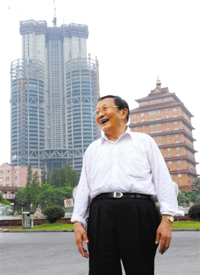2009年8月12日,吳仁寶在華西村幸福園與村民交談。他的身后是當時正在建設的“華西增地空中新農村大樓”。 新華社記者 孫參 攝