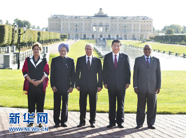 國家主席習(xí)近平5日在圣彼得堡出席金磚國家領(lǐng)導(dǎo)人非正式會晤,同巴西總統(tǒng)羅塞夫、俄羅斯總統(tǒng)普京、印度總理辛格、南非總統(tǒng)祖馬就金磚國家合作以及重大國際和地區(qū)問題交換意見、協(xié)調(diào)立場。習(xí)近平強(qiáng)調(diào),面對各種風(fēng)險(xiǎn)和挑戰(zhàn),金磚國家要凝聚在重大問題上的共識,加強(qiáng)團(tuán)結(jié)合作。