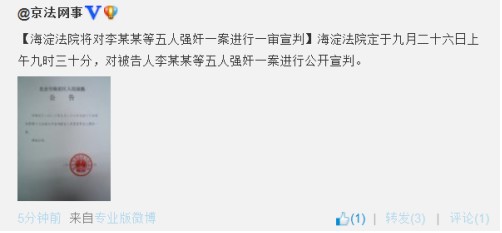 據(jù)北京法院網(wǎng)官方微博“京法網(wǎng)事”消息,海淀法院定于9月26日上午9時(shí)30分,對(duì)被告人李某某等五人強(qiáng)奸一案進(jìn)行公開宣判。