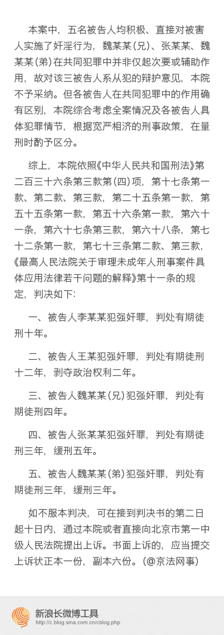 據北京法院網官方微博“京法網事”消息,海淀法院于今日上午9時30分公開宣判被告人李某某、王某、魏某某(兄)、張某某、魏某某(弟)強奸一案。李某某被判有期徒刑十年。