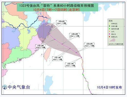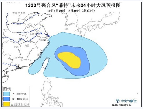 中央氣象臺(tái)預(yù)報(bào),受“菲特”和冷空氣的共同影響,4日20時(shí)至5日20時(shí),臺(tái)灣以東洋面、東海大部海域、我國(guó)釣魚島附近海域、臺(tái)灣海峽、南海東北部、巴士海峽、臺(tái)灣沿海、福建沿海、浙江沿海及杭州灣將有7至9級(jí)大風(fēng)。其中臺(tái)灣以東洋面和東海東南部的部分海域風(fēng)力有10至12級(jí),“菲特”中心經(jīng)過的附近海域的風(fēng)力有13至15級(jí),臺(tái)灣北部將有大到暴雨。