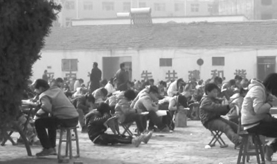 距臺(tái)前縣政府1公里之遙的城鎮(zhèn)中學(xué),由于教室不充裕,學(xué)生在室外空地上考試。網(wǎng)絡(luò)截圖