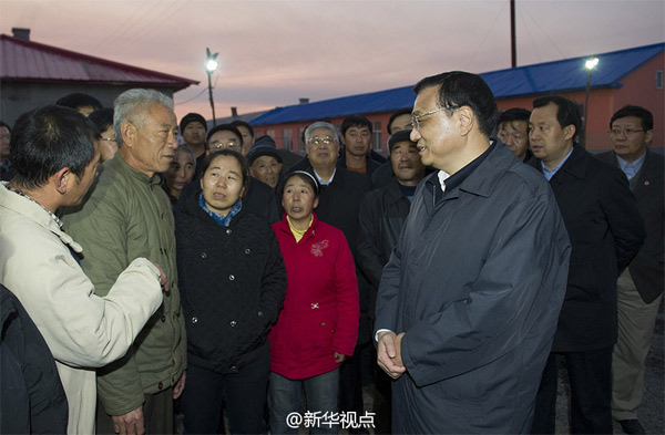 據(jù)新華社“新華視點”微博報道,李克強4日來到同江銀川鄉(xiāng)幸福大院。這里是五保戶和特困戶安置點。在符合購買幸福大院住房條件公式欄下,李克強幫患病特困戶邢方才查詢,邢方才高興地告訴總理自己榜上有名。幸福大院10月6日開工,建有8棟32戶平房,己基本完工通暖,可讓當(dāng)?shù)匚灞艉拓毨魷嘏^冬。