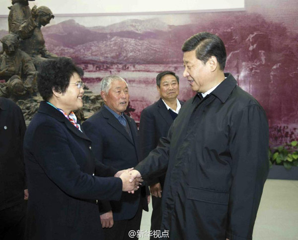 習(xí)近平在展廳會(huì)見了“沂蒙母親”王換于孫女于愛梅等模范人物。他表示,這次來沂蒙就是看望老區(qū)人民,重溫沂蒙精神。革命勝利來之不易,主要是黨和人民水乳交融,黨把人民利益放在第一位,為人民謀解放,人民跟黨走,無私奉獻(xiàn),可歌可泣。∫拭删褚罅霌P(yáng)。