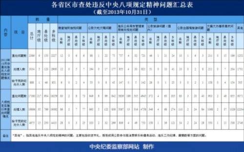據(jù)統(tǒng)計(jì),2013年10月份,各省區(qū)市查處問題總計(jì)2386件;處理3034人;給予黨政紀(jì)處分898人。其中,被處理的地廳級(jí)人員5人;被給予黨政紀(jì)處分的地廳級(jí)人員1人。