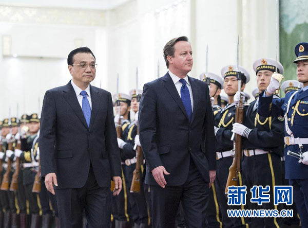 國務(wù)院總理李克強2日上午在人民大會堂北大廳舉行歡迎儀式,歡迎來華進行正式訪問并出席中英總理年度會晤的英國首相卡梅倫。