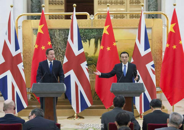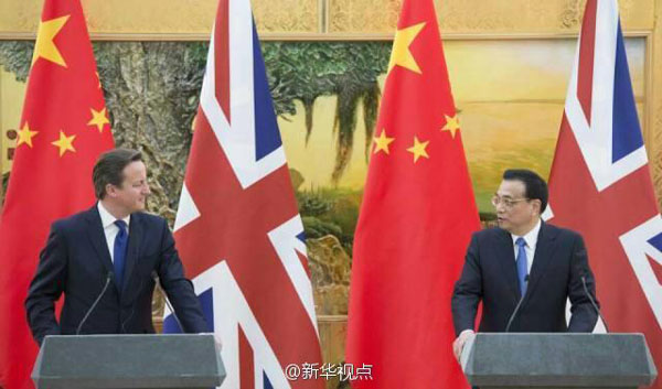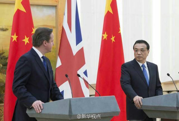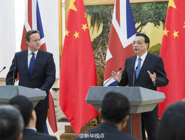 國務(wù)院總理李克強(qiáng)2日在人民大會堂與英國首相卡梅倫共同會見記者,介紹中英總理年度會晤成果。