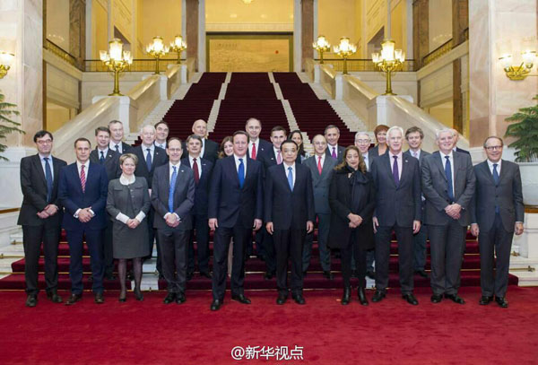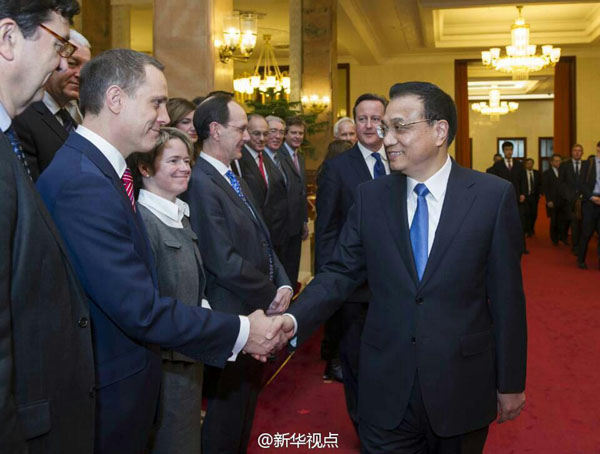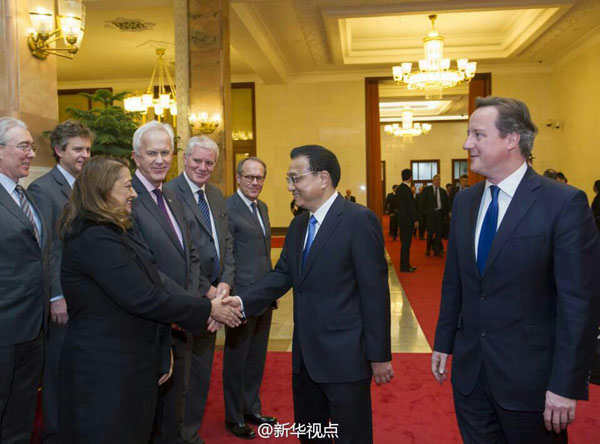 國務(wù)院總理李克強2日與英國首相卡梅倫舉行會談后,共同會見了隨同卡梅倫首相訪華的英國企業(yè)家代表。