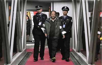 昨日,外逃6年的“百名紅通”10號(hào)嫌犯裴健強(qiáng)被抓獲歸案。圖為裴健強(qiáng)(中)被執(zhí)法人員帶離北京首都國際機(jī)場。新華社發(fā)