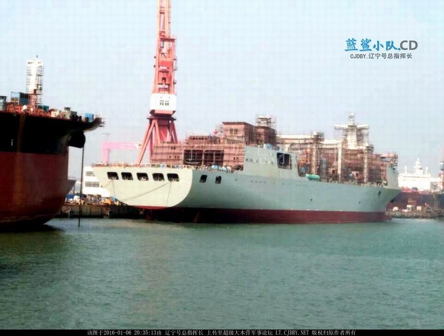 國內(nèi)知名軍事論壇的圖片顯示,一艘國產(chǎn)大型補(bǔ)給艦已經(jīng)下水,從外形上看該艦與目前已經(jīng)建造服役的903、903A型補(bǔ)給艦有明顯差別。有分析這是我國正在建造的901型大型綜合補(bǔ)給艦,其排水量預(yù)計(jì)可達(dá)4至5萬噸左右。