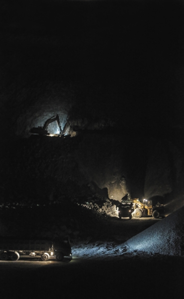 2015年12月27日晚9點,河北省三河市東部礦區(qū),兩側山嶺上燈光閃爍,挖掘機的杵子(鉆頭)一下下鉆進山體,沿路一輛接一輛的大卡車,滿載著石料揚長而去。