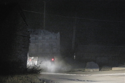 其中一輛貨車沿礦山路駛出,到達十百戶村村口對面的存料場。