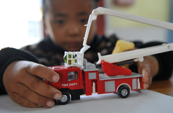 這是云南省德宏傣族景頗族自治州隴川縣景罕鎮(zhèn)廣宋村的一名艾滋病致孤兒童在村里的兒童活動(dòng)中心里玩玩具(2011年11月17日攝)。