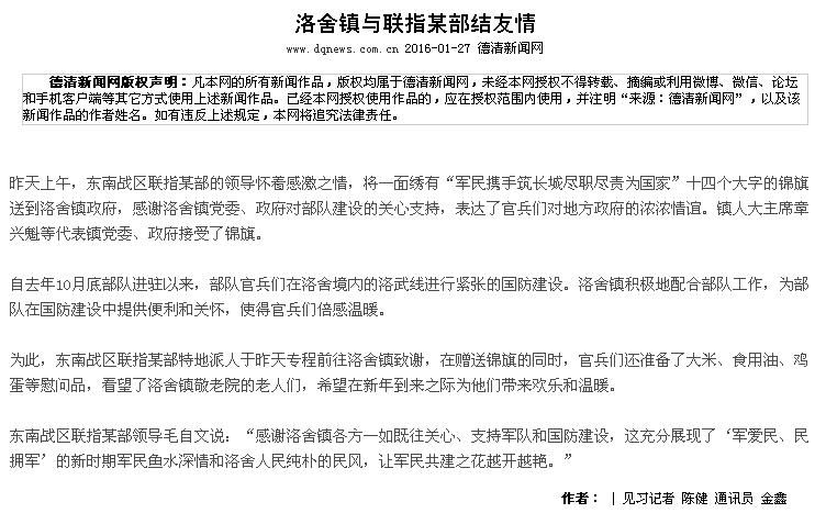 自去年10月底部隊進駐以來,部隊官兵們在洛舍境內(nèi)的洛武線進行緊張的國防建設(shè)。洛舍鎮(zhèn)積極地配合部隊工作,為部隊在國防建設(shè)中提供便利和關(guān)懷,使得官兵們倍感溫暖。