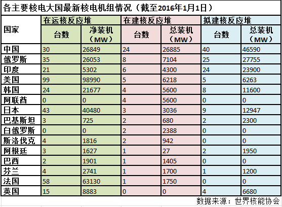 截至2016年1月1日,包括中國臺(tái)灣在內(nèi)的6臺(tái)在運(yùn)核反應(yīng)堆,以及2臺(tái)在建核反應(yīng)堆,全球在運(yùn)核電反應(yīng)堆共439座,總裝機(jī)共計(jì)38.25萬兆瓦,在建反應(yīng)堆66座,裝機(jī)容量達(dá)7.03萬兆瓦,擬建設(shè)核電反應(yīng)堆為158座,裝機(jī)容量為17.92萬兆瓦。