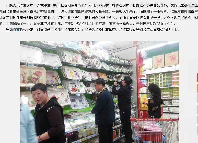“今晚去大潤(rùn)發(fā)購(gòu)物,無(wú)意中發(fā)現(xiàn)新上任的劉賜貴省長(zhǎng)與我們這些百姓一樣也在購(gòu)物,仔細(xì)在看各種商品價(jià)格,居然大家都沒(méi)有注意到……”
