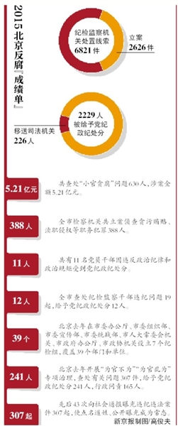 2015年,北京市加大執(zhí)紀(jì)審查力度,全市紀(jì)檢監(jiān)察機(jī)關(guān)共處置線索6821件,立案2626件,立案數(shù)同比增長84.4%;結(jié)案2279件;2229人被給予黨紀(jì)政紀(jì)處分,移送司法機(jī)關(guān)226人,同比分別增長75.8%、22.2%。