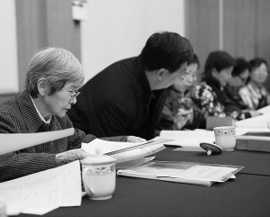 全國(guó)政協(xié)委員樊錦詩(shī)(左一)仔細(xì)翻閱擬提交提案本報(bào)記者 李楊 攝