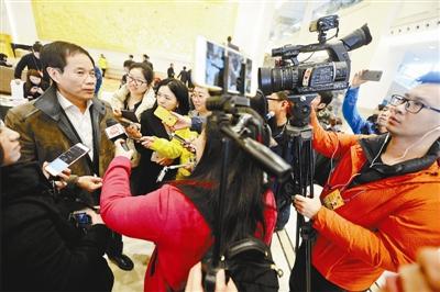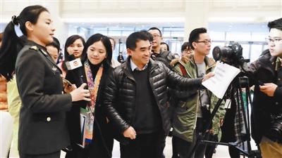 政協(xié)委員梁滿林報到后,被眾多媒體記者“包圍” 攝影/本報記者 魏彤