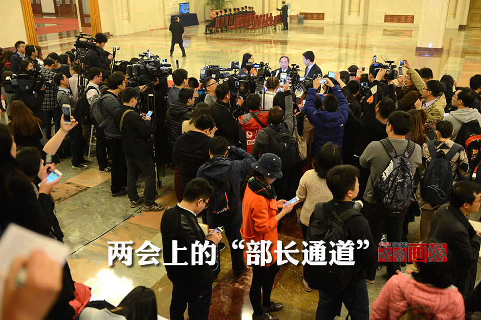 每年兩會(huì),人民大會(huì)堂北大廳都是各家媒體派“重兵”把守的“重要關(guān)隘”之一。因?yàn)榘凑諔T例,在人民大會(huì)堂北大廳,有一段長(zhǎng)約百米鋪就紅毯的路,國(guó)務(wù)院各部委主要負(fù)責(zé)人進(jìn)出會(huì)場(chǎng)經(jīng)常由此通過,媒體報(bào)道時(shí)習(xí)慣性地稱之為“部長(zhǎng)通道”。圖為3月3日,全國(guó)政協(xié)十二屆四次會(huì)議在北京人民大會(huì)堂開幕,“部長(zhǎng)通道”記者云集。 中新社記者 王東明 攝