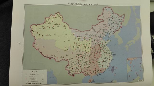 在第二張彩圖上,藍(lán)色三角塊標(biāo)注有28個(gè)在建運(yùn)輸機(jī)場(chǎng);紅色方塊標(biāo)注有163個(gè)規(guī)劃新增運(yùn)輸機(jī)場(chǎng);研究布局運(yùn)輸機(jī)場(chǎng)有11個(gè)……