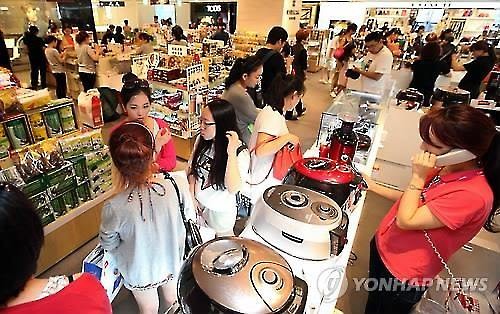 資料圖片:中國游客們在韓國免稅店選購電飯煲。(韓聯(lián)社)