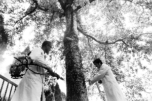 為抑制楊絮,北京市園林科學(xué)研究院的工作人員為楊樹“打針”。