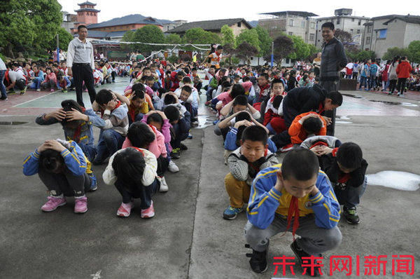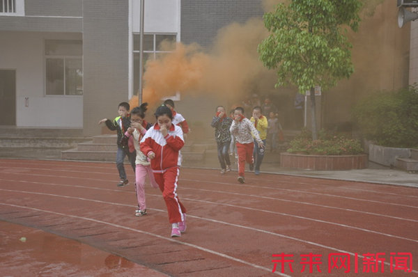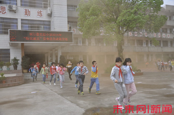 “嗚——嗚——”昨日下午,隨著急促警報聲的突然響起,福建省長汀縣實驗小學的學生們紛紛拿出準備好的手帕或毛巾捂住口鼻迅速跑向操場疏散。