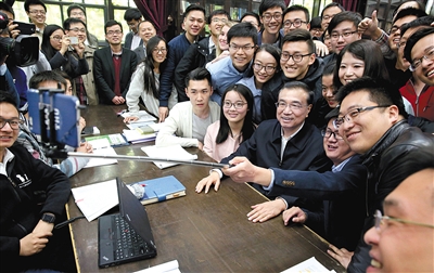 昨日,清華大學(xué)圖書館閱覽室,李克強(qiáng)總理與清華師生“自拍”。