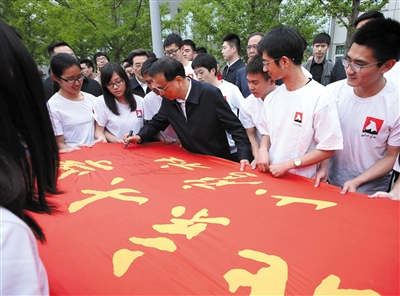 昨日,在考察北京大學(xué)時,李克強(qiáng)在北大山鷹社社旗上簽名。