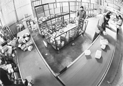 河北秦皇島海港區(qū)臨港物流園區(qū)一家快遞公司內(nèi),快遞員正在分揀快遞包裹。