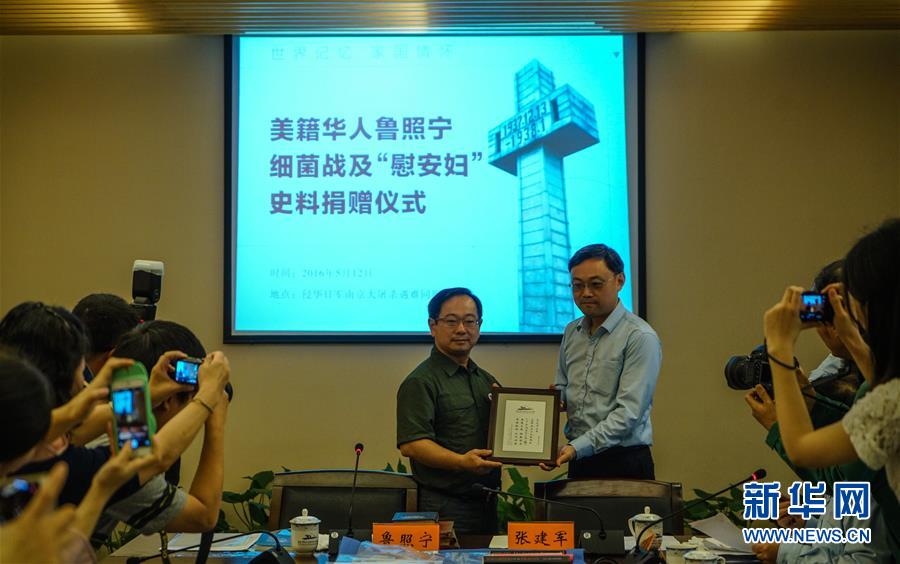 5月12日,在侵華日軍南京大屠殺遇難同胞紀念館,館長張建軍向魯照寧(左)頒發(fā)捐贈證書。記者當日從侵華日軍南京大屠殺遇難同胞紀念館獲悉,該館最新獲贈173件反映侵華日軍在中國使用化學武器和研制細菌武器、強征“慰安婦”等方面的史料,包含美國國家檔案館和美國軍事部解密的部分文件、照片,來自侵華日軍私人相冊的“慰安婦”歷史照片等。據(jù)了解,這批史料均由美籍華人魯照寧捐贈。2004年以來,他已先后12次向該館捐贈實物、史料等超過1500件。 新華社記者 李響 攝