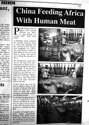 文中說道,贊比亞政府強烈譴責(zé)不道德的媒體刊發(fā)關(guān)于中國向南部非洲銷售人肉的文章。贊比亞外交部公共關(guān)系官員多卡斯說,今年5月17日,一家私營報紙“KACHEPA”(意為八卦、傳言)刊登了這篇不實文章,宣稱中國將人肉罐頭出口到南部非洲。