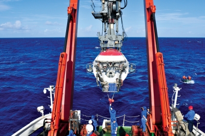 水面支持系統(tǒng)操作人員在布放“蛟龍”號(hào)載人潛水器。