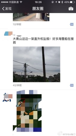 國(guó)家海洋局東海分局7日晚通報(bào),當(dāng)日,中國(guó)海監(jiān)一架直升機(jī)在執(zhí)行飛行任務(wù)返航途中失聯(lián)。傍晚,搜尋人員在舟山朱家尖大青山山頂發(fā)現(xiàn)飛機(jī)殘骸,四位機(jī)組人員被發(fā)現(xiàn)遇難。圖為6月7日,搜救人員前往失事海域搜尋(手機(jī)拍攝)。 新華社發(fā) 圖片來源:新華網(wǎng)