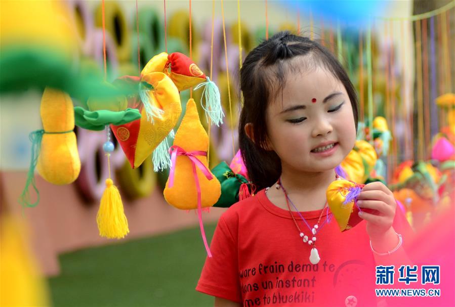 6月8日,山東省沂源縣悅莊幼兒園的一名小朋友在觀看佩戴的香囊。端午節(jié)臨近,山東省沂源縣悅莊幼兒園開展“制作香囊迎端午”活動,小朋友們在老師的指導(dǎo)下,一起縫制香囊,了解傳統(tǒng)民俗,迎接端午節(jié)的到來。新華社發(fā)(趙東山 攝)