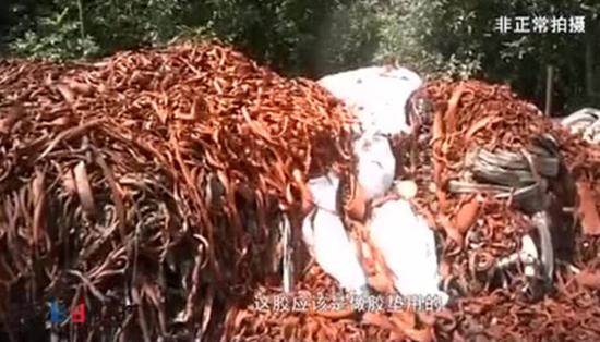 張老板把記者帶進了眼前的這個普通的農(nóng)村庭院,走進大門,廢棄輪胎、廢棄電纜、還有一些叫不上名字的橡膠制品交織在一起,堆起了一座座小山。張老板告訴記者:就是這些垃圾橡膠制品,打成黑顆粒,就成了跑道最底下的那層配色了。