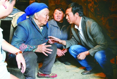 云南省曲靖市馬龍縣王家莊街道莊郎社區(qū)黨支部書記張炳才(右一)在了解81歲的許留英老人的生活狀況,為其制定精準(zhǔn)脫貧方案。新華社發(fā)