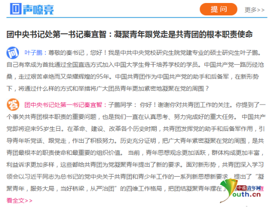 團(tuán)中央書記處第一書記秦宜智通過“青年之聲”回答中共中央黨校研究生葉子鵬的提問。網(wǎng)頁截圖
