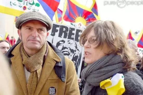 而在這群阻攔和抗議的藏·獨分子中,就有身披藏·獨旗幟的Jane Birkin。