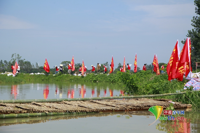 團(tuán)旗在堤壩上飄揚(yáng)。中國青年網(wǎng)記者 周學(xué)磊 攝