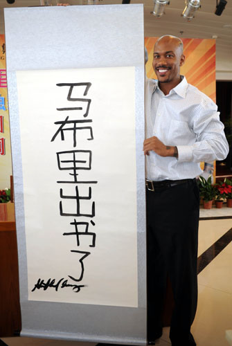 圖為2012年5月10日,北京首鋼籃球俱樂部外援馬布里展示自己用毛筆書寫的“馬布里出書了”條幅。新華社發(fā)