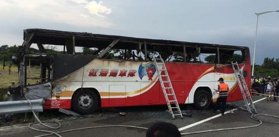 圖說:臺灣游覽車起火造成26人罹難,包括24名大陸游客。這是7月19日拍攝的事故車輛。新華社發(fā)