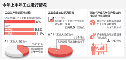 “所謂緩中趨穩(wěn)主要表現(xiàn)在三個(gè)方面!瘪T飛說,一是規(guī)模以上工業(yè)增加值增速較穩(wěn),上半年6%的增長,與年初提出的預(yù)期增長目標(biāo)基本吻合;制造業(yè)對工業(yè)穩(wěn)增長的支撐作用增強(qiáng),上半年制造業(yè)增加值增速6.9%,比一季度加快0.4個(gè)百分點(diǎn)。